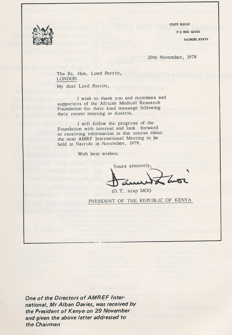 Letter from President Daniel Toroitich arap Moi to African Medical and Research Foundation
